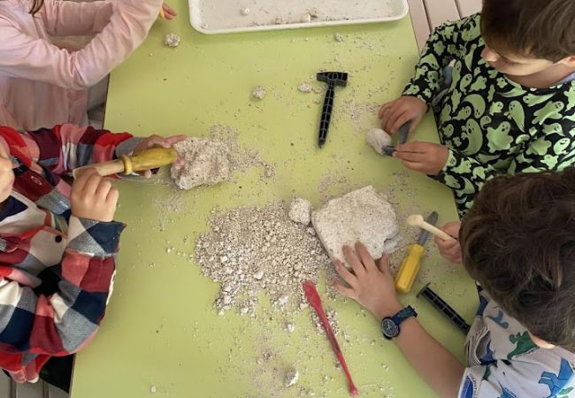 Στο πλαίσιο του εκπαιδευτικού προγράμματος (project) «Που είναι κρυμμένη η Ζωή;» τα παιδιά ανέλαβαν ρόλους (αρχαιολόγοι, φωτογράφοι, εργάτες, συντηρητές ) και πραγματοποίησαν ανασκαφή σε διαμορφωμένο χώρο του σχολείου όπου ανακάλυψαν οστά δεινοσαύρων. Η ανασκαφή τα βοήθησε να συλλέξουν νέα στοιχεία για τη ζωή των δεινοσαύρων και να εμπλουτίσουν την έρευνά τους.